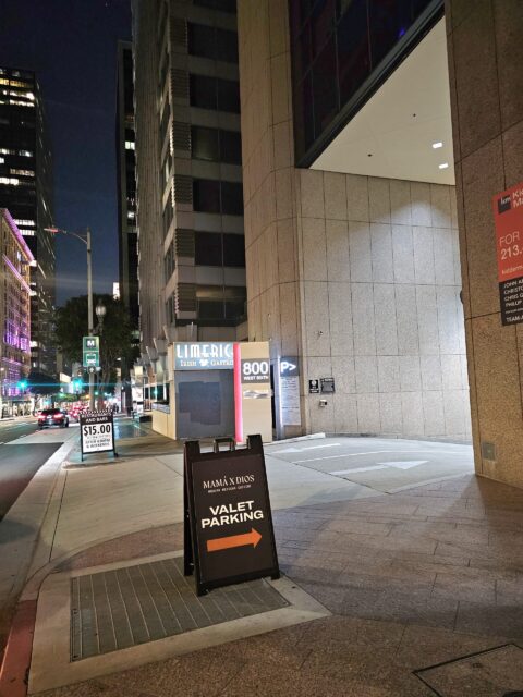 Garage entrance is on Flower Street, south of 6th Street on the right. There is a monument to the left of the entrance that displays “800 WEST SIXTH”.